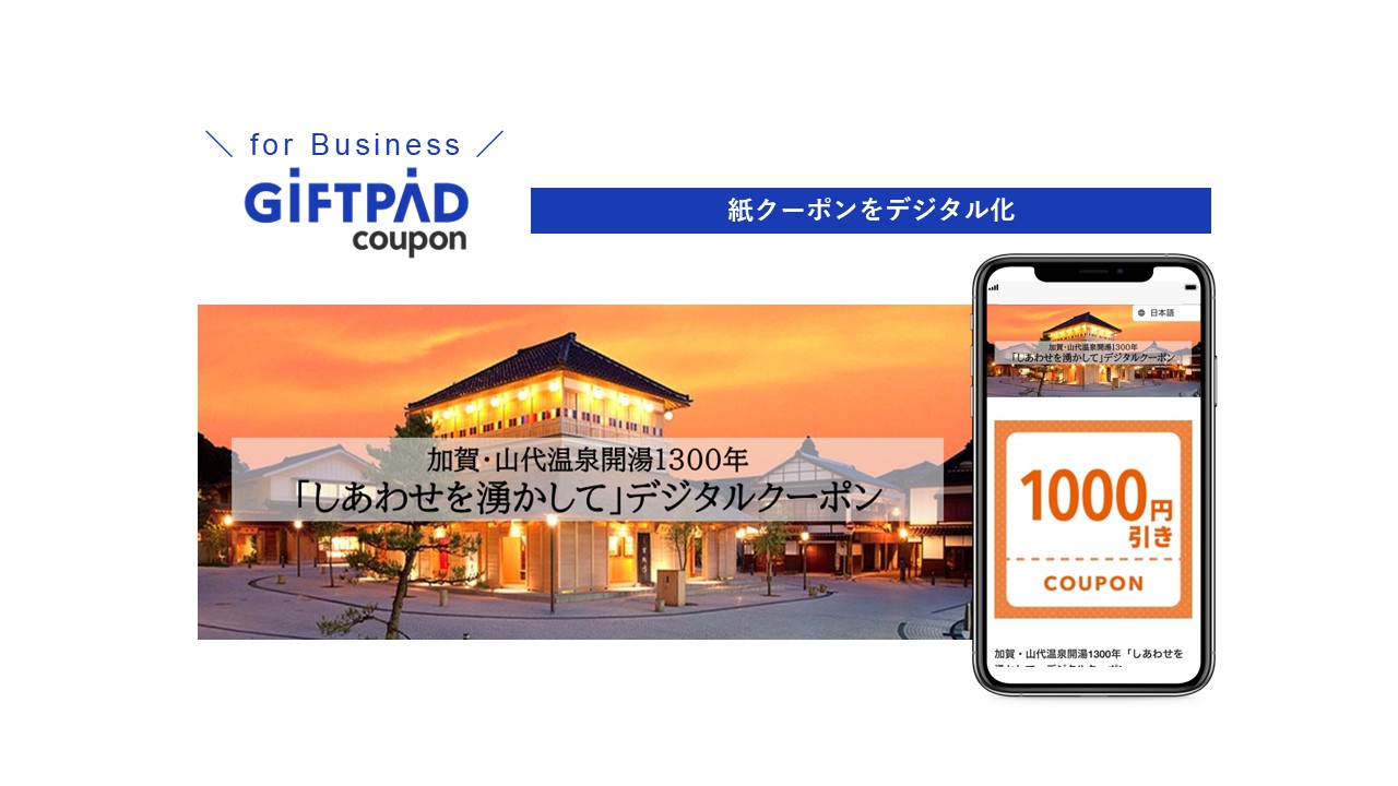 企業や自治体のDXを支援する株式会社ギフトパッド(本社:大阪府大阪市、代表取締役:園田 幸央、以下 ギフトパッド)は、石川県・山代温泉観光協会(所在地:石川県加賀市)が実施する“山代温泉開湯1300年「しあわせを湧かして」”キャンペーンにおいて、デジタルクーポンサービス「Giftpad coupon」が採用されたことをお知らせいたします。